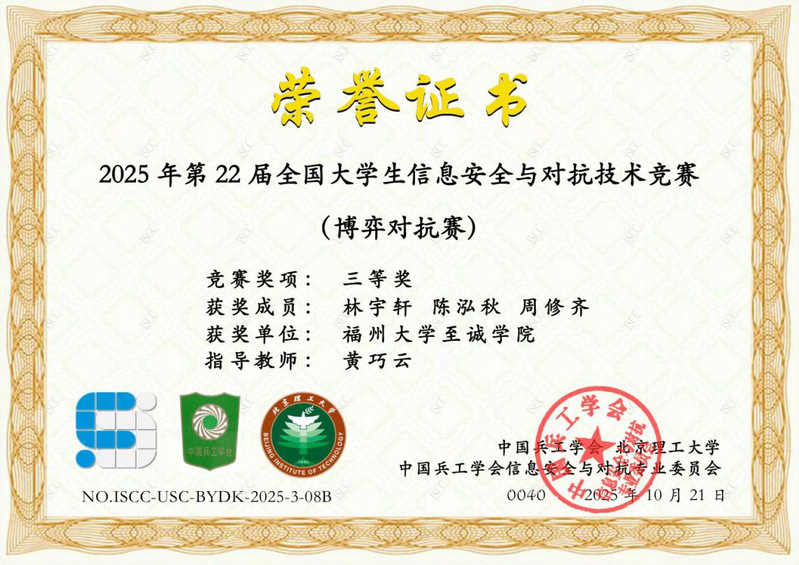 此次学院在ISCC赛事中斩获佳绩,不仅是对同学们专业能力与拼搏精神的有力印证,也充分体现了学院在信息安全学科建设与人才培养方面的扎实成效。未来,学院将继续坚持以赛促学、以学促用,强化实践教学与创新能力培养,为学生搭建更多展示自我、提升技能的平台,助力培养更多服务于国家网络安全战略的高素质专业人才。