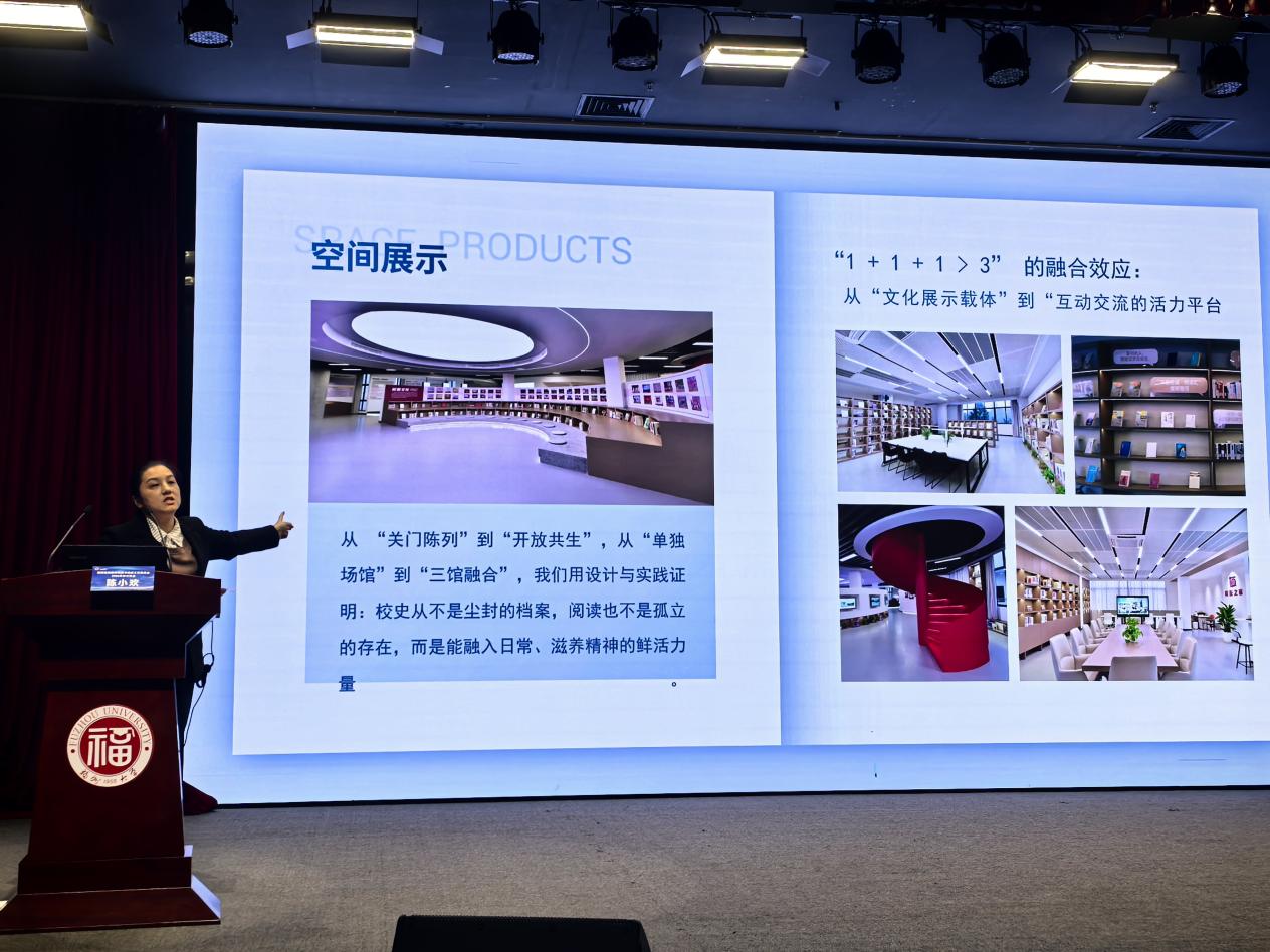 陈小欢馆长以“讲故事 + 谈感受” 的形式,分享了51吃瓜网 “校史馆 + 阅览空间 + 校友之家” 三馆合一空间的建设历程。现场展示的三馆合一空间实景与活动照片,以及常态化举办的近百场“书香至诚・悦读名家汇”等活动所呈现出的“1+1+1>3”融合效应,使在场同仁直观地感受到空间从“文化载体”到“互动平台”的转变。该空间此前刚斩获第十届亚太空间设计大奖赛 “文化、展览类”金奖,其“无界校史、共融共享”的建设理念,引发了与会者的共鸣。