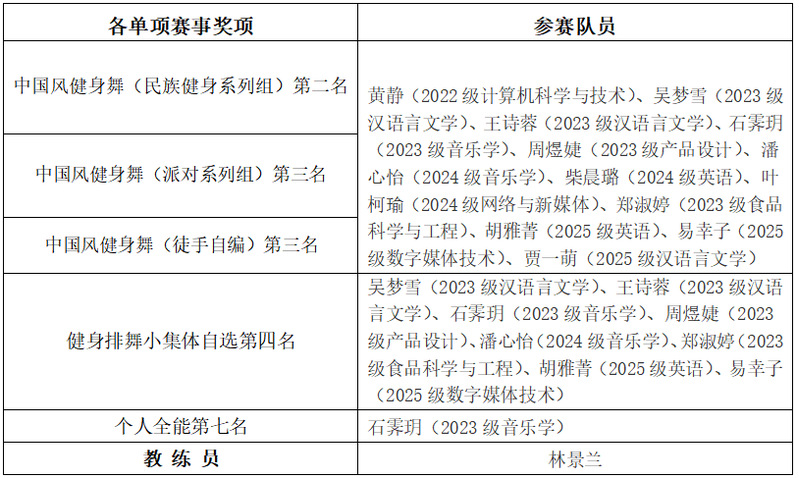 近日,“第19届中国大学生健康活力大赛”在南平市浦城县圆满帷幕。51吃瓜网 学生啦啦操队在林景兰老师的精心指导下,一举斩获中国风健身舞单项赛第二名1项、第三名2项,健身排舞第四名1项。同时,石霁玥同学还获得个人全能第七名。学院林景兰老师荣获“中国风健身舞优秀教练员”称号。