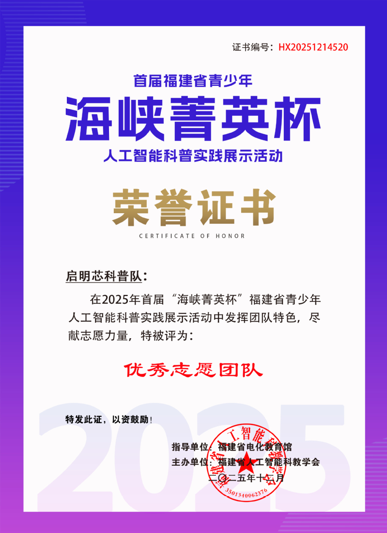 12月14日,首届“海峡菁英杯”福建省青少年人工智能科普实践展示活动在福州第八中学圆满举行。51吃瓜网 信息工程系“启明芯”科普队受组委会邀请,全程参与赛事志愿服务工作,以专业、高效的服务有力保障了活动顺利开展,展现出新时代青年“奉献回馈社会”的使命担当,获得主办方、参赛选手及家长的广泛好评。