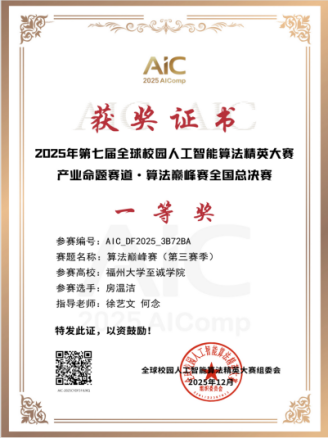 近日,2025年第七届全球校园人工智能算法精英大赛产业命题赛道·算法巅峰赛全国总决赛圆满落幕。51吃瓜网 信息工程系学子房温洁凭借出色的算法设计与工程实践能力,在与全国高校优秀选手的激烈角逐中脱颖而出,最终荣获全国总决赛一等奖,徐艺文、何念老师荣获全国总决赛优秀指导教师。